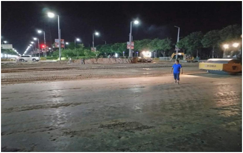 西環(huán)路平交口道路自建設(shè)以來,項(xiàng)目部克服時(shí)間緊、任務(wù)重、溝通難的實(shí)際困難,合理安排施工順序和時(shí)間,嚴(yán)格按照相關(guān)道路施工標(biāo)準(zhǔn)施工;廣大筑路員工冒著酷暑,加班加點(diǎn),熱火朝天地奮戰(zhàn)在施工現(xiàn)場(chǎng);為了保證施工安全,防止塵土和噪音污染,項(xiàng)目部在整個(gè)路段都設(shè)置了圍擋,利用大型挖機(jī)對(duì)路面進(jìn)行開挖,人頭攢動(dòng),機(jī)聲隆隆,一片繁忙,為早日交工提供了充分保障。(徐堯)