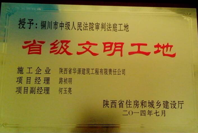 在公司領(lǐng)導(dǎo)層的指導(dǎo)下及項(xiàng)目部各人員的努力工作下,秉承務(wù)實(shí)求真高效的原則,由我公司承建的銅川市中級(jí)人民法院審判法庭工地被評(píng)為省級(jí)文明工地,榮獲省級(jí)文明工地榮譽(yù)證書(shū)。該項(xiàng)目由銅川市中級(jí)人民法院投資建設(shè),由陜西建新項(xiàng)目管理咨詢有限公司負(fù)責(zé)監(jiān)理,由陜西省華源建筑工程有限責(zé)任公司承建。